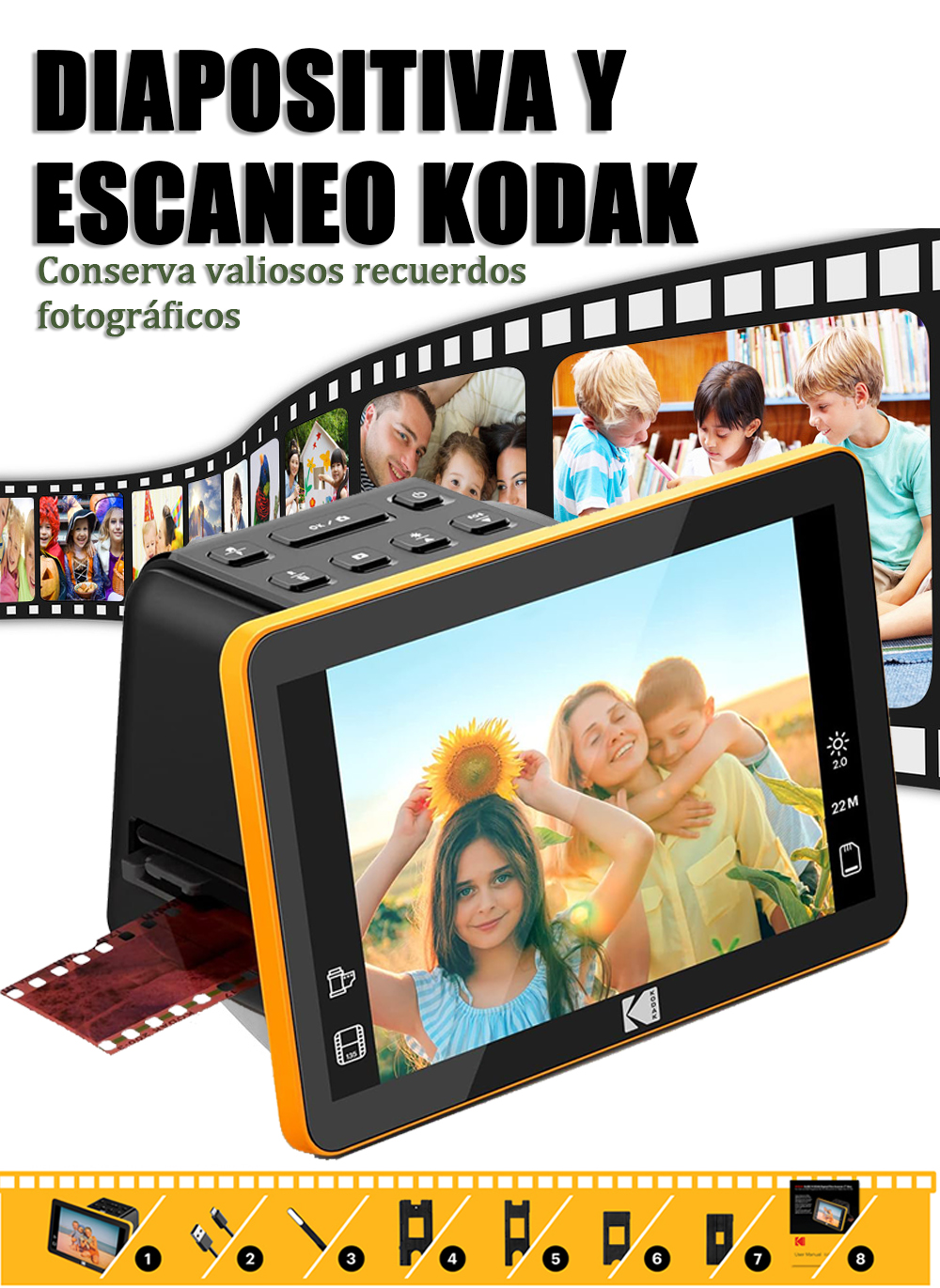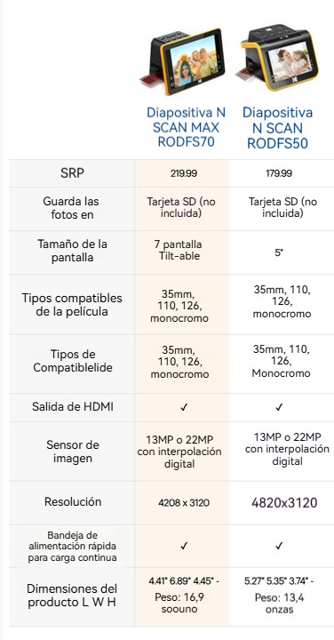 Almacena miles de imágenes de alta calidad sin necesidad de una computadora.Con tecnología infrarroja avanzada, detecta y repara automáticamente el polvo y los arañazos durante el proceso de escaneo, garantizando una calidad óptima en cada imagen. Incluso las películas antiguas y dañadas se restauran para obtener imágenes nítidas e impecables.Ya se trate de película de formato medio 120 (compatible con 6 x 4,5 cm a 6 x 12 cm) o de negativos o diapositivas de formato 35 mm de 135, el KODAK Slide N SCAN admite perfectamente todos los tipos, lo que permite conservar fácilmente diversas películas y adaptarse a diferentes necesidades de fotografía.No necesitas computadora: simplemente inserta tu película, presiona un botón y guarda tus imágenes al instante en una tarjeta SD. ¡Sencillo, rápido y listo para compartir!
