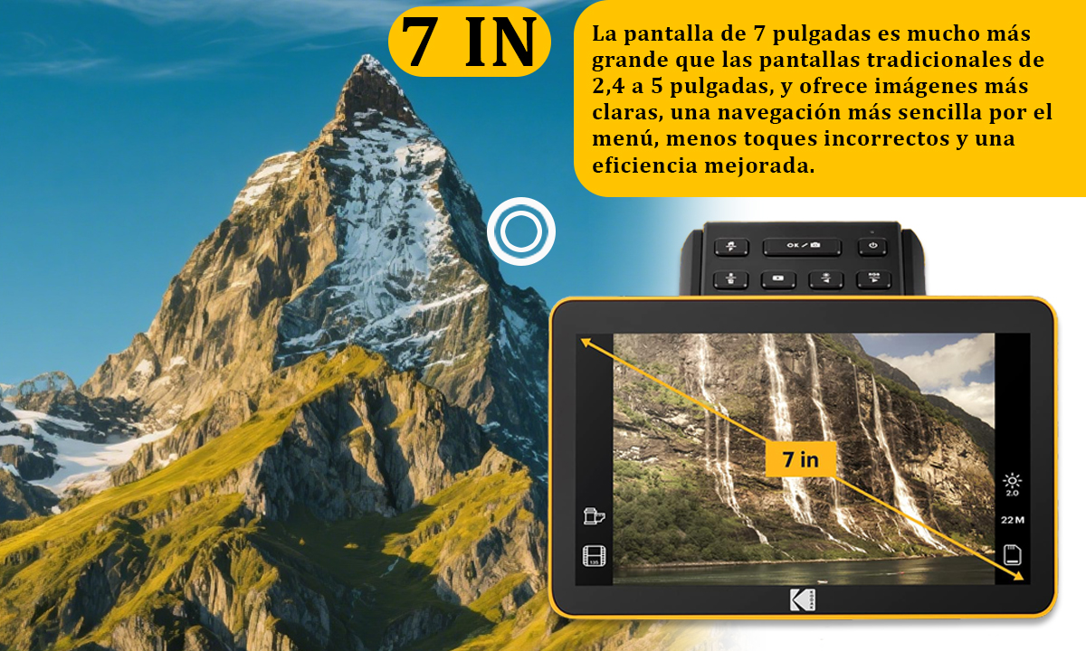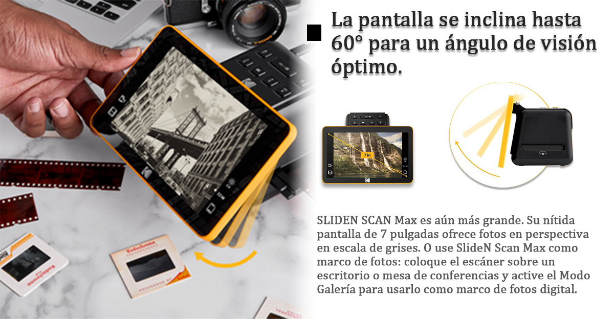 Con KODAK Slide N SCAN, puede transformar sus películas antiguas en imágenes nítidas y vibrantes y revivir al instante esos momentos preciosos. Cada escaneo revive sus recuerdos con una claridad asombrosa, a solo un clic.Vista previa instantánea: la pantalla LCD de 7″ le permite ver exactamente lo que obtiene, lo que hace que los ajustes sean rápidos y fáciles.Pantalla inclinable hasta 60° para un ángulo de visión óptimo, lo que le permite ajustarla cómodamente a su posición. Ya sea sentado o de pie, disfrute de una vista nítida y cómoda de sus escaneos sin forzar el cuello.Adaptadores de Carga Rápida